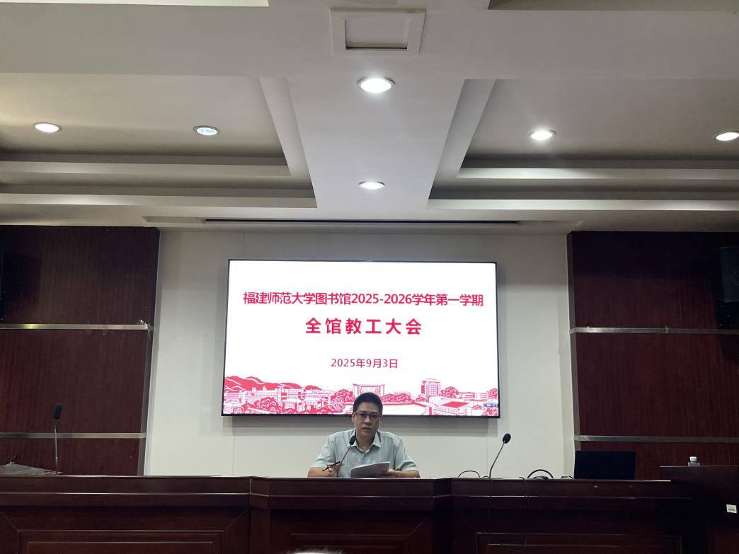2025年9月3日下午,图书馆新学期全馆教职工大会在仓山校区逸夫楼举行。会议由馆长吴巍巍主持,全馆教职工参加。