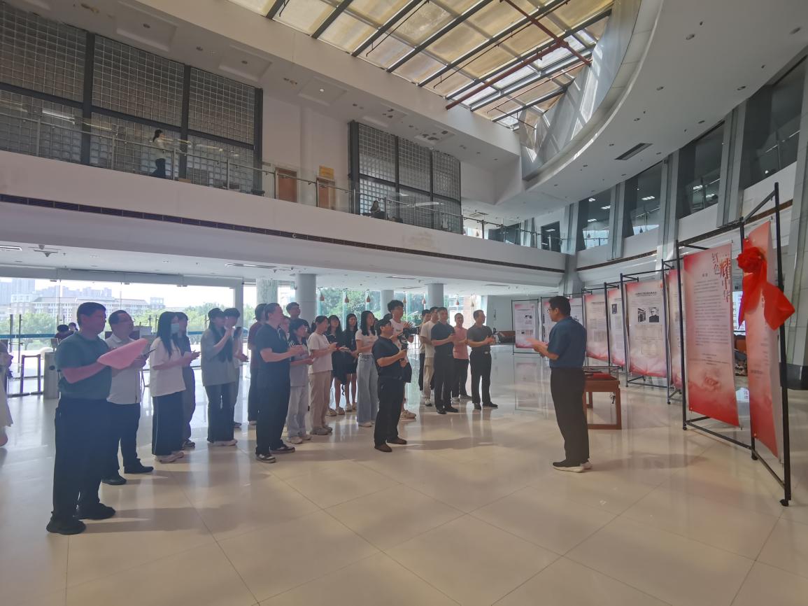 在展览观摩环节,吴馆长结合展陈内容,为全体党员和嘉宾作了详实而生动的现场讲解。他重点介绍了各个历史时期具有代表性的红色出版物及其背后的历史背景与重要意义,指出这些文献不仅是革命历程的真实记录,更是理想信念和革命精神的重要载体。