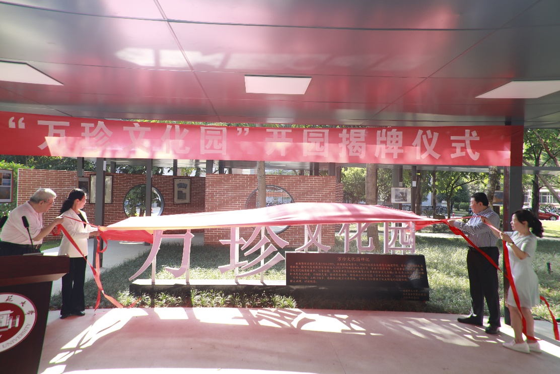 万珍园揭牌仪式于10月9日下午在旗山校区万珍文化园举行,校党委副书记陈晓红研究员,吕振万先生家族代表、厦门东亚房地产有限公司、厦门侨华有限公司总经理黄惠如先生、厦门东亚房地产有限公司、厦门侨华有限公司经理吴健女士,福建师范大学香港校友会永远荣誉会长卢象乾校友以及校党委统战部(校友会)、宣传部(文明办)、教育基金会、后勤管理处(后勤服务集团)、美术学院、图书馆等部门(学院)领导、师生代表等七十余人参加了仪式。揭牌仪式由校图书馆吴巍巍馆长主持。