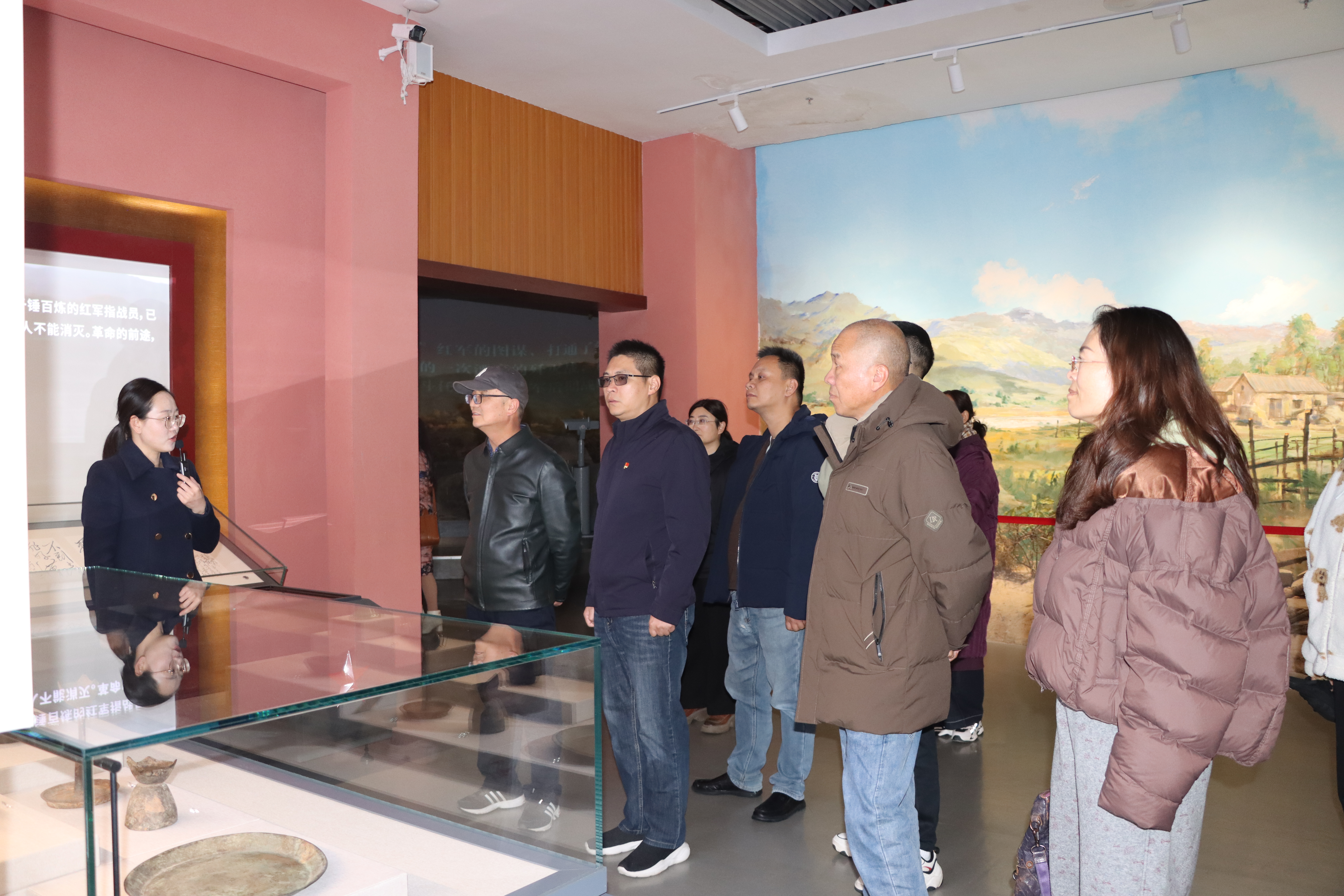 行至山顶,六盘山红军长征纪念馆巍然矗立。党员同志们步入馆内,400余幅珍贵照片、220余件革命实物即刻将众人带回烽火连天的岁月。磨损的草鞋记录着万里征途的艰辛,生锈的刀枪镌刻着浴血奋战的痕迹,泛黄的文件见证着革命决策的英明,而红二十五军赠送的“回汉兄弟亲如一家”锦匾复制品,则诉说着军民同心的动人佳话。讲解员饱含深情的讲述,让党员们仿佛看到了红军将士翻越最后一座高山时的豪迈气概。在 “三军会师” 展区,1936年10月红一、红二方面军在将台堡胜利会师的场景复原,让大家深刻铭记这一标志长征胜利结束的历史时刻。