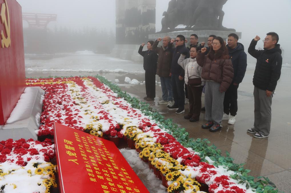 纪念广场上,三面红旗造型的影壁墙庄严肃穆,江泽民同志题写的馆名熠熠生辉。全体党员整齐列队,面向鲜红的党旗,在马娟书记的领誓下高举右拳:“我志愿加入中国共产党,拥护党的纲领,遵守党的章程……” 铿锵有力的誓言穿透云层,在六盘山谷间久久回荡。