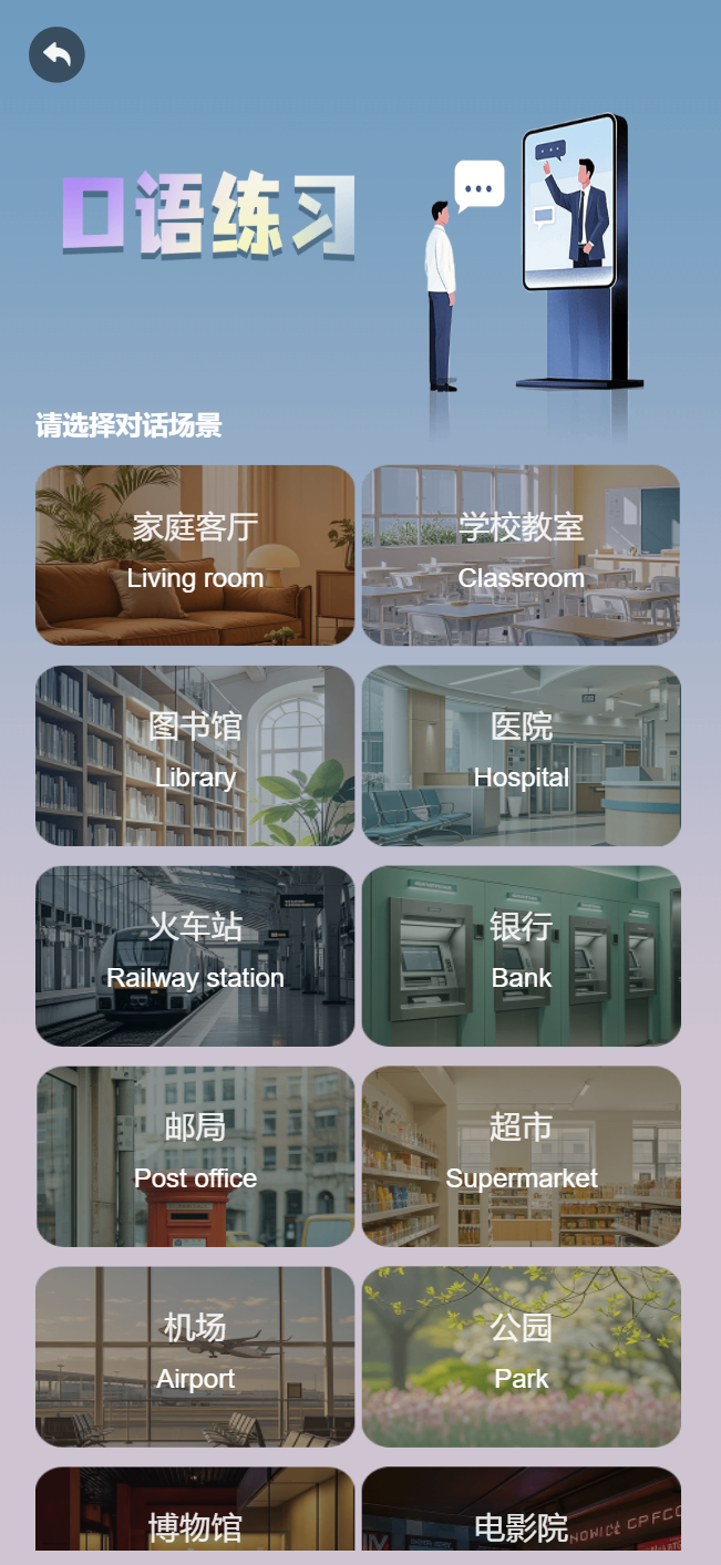 用户选择语种后,可基于选择语种选择不同场景的口语练习环境,各练习语种支持场景包括主流场景:家庭客厅、学校教室、图书馆、医院、超市、公园等,同时也支持各非主流场景:农场、音乐厅、画廊、剧院等。