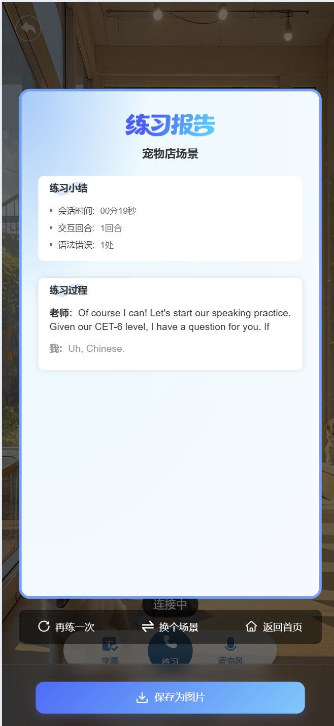 系统自动生成练习分析报告,汇总语法错误、发音精准度、完整度、流利度等内容,助力用户针对性强化学习。包括场景练习报告小结、单词练习报告小结、普通话评测报告小结。