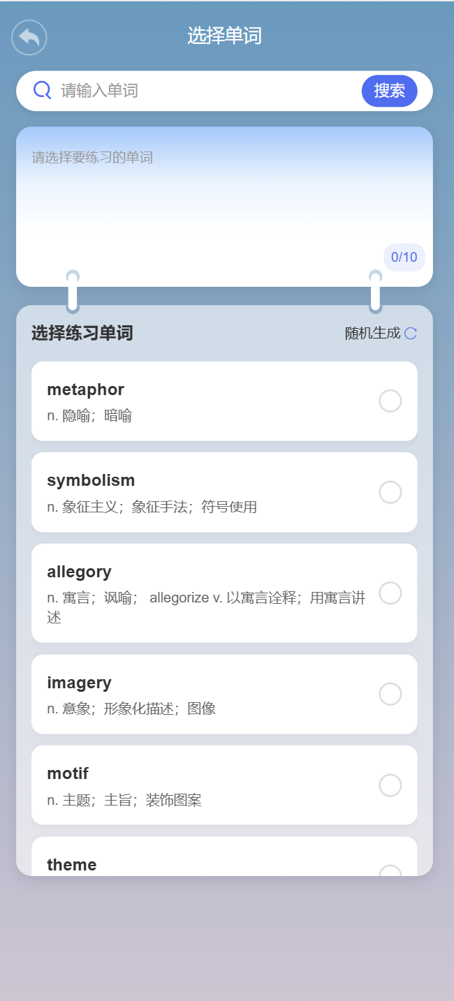提供英语专业四级/八级、雅思、托福、英语四六级等专业考试词汇练习,基于选择词汇进行造句,提供试听及练习服务,帮助用户熟悉词汇及其用法。