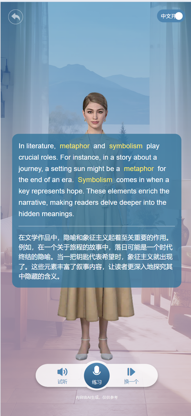 基于具体练习场景,AI口语练习智能体主动提供话题演练内容,引导用户参与话题讨论,营造沉浸式练习氛围,激励用户开口表达,提升口语表达能力。
