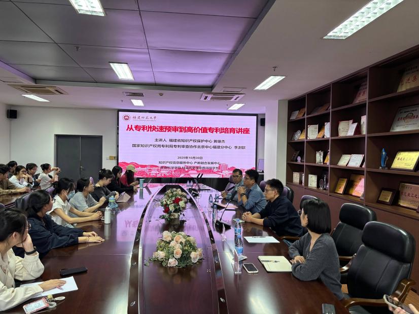 10月30日,福建师范大学又玄图书馆多功能会议室举办一场由高校、知识产权保护机构、专利审查专业机构三方联动打造的知识产权交流活动。本次活动以“从专利快速预审到高价值专利培育”为主题,通过跨单位资源整合与服务协同,精准对接师生专利素养提升需求,构建了校地协同的知识产权服务新模式。