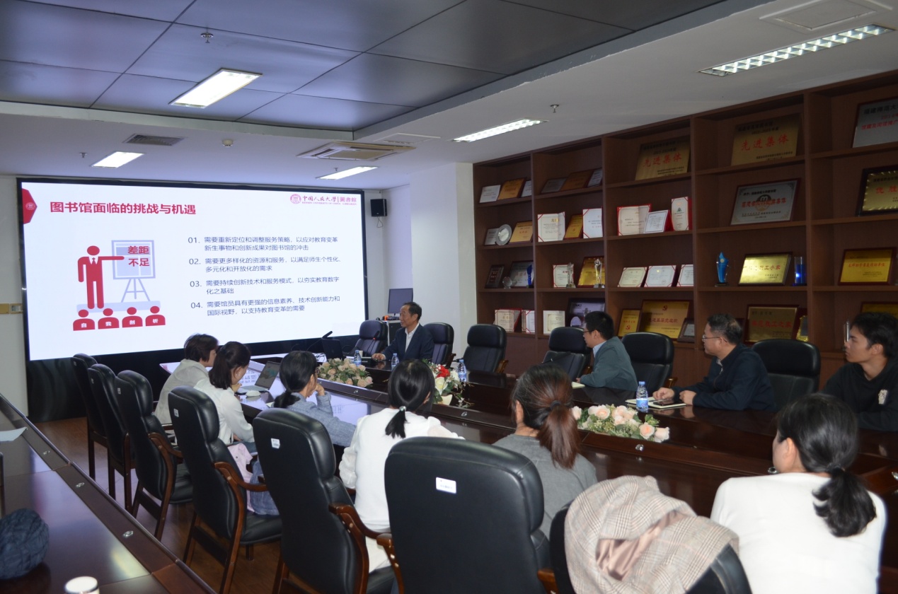 张斌教授围绕教育变革对图书馆的影响、未来图书馆角色定位、未来图书馆发展思路三个方面展开。他认为,在教育变革背景下,基于图书馆内外环境分析及角色定位,紧密围绕高校教育整体事业发展和教育强国建设要求,立足教学科研支撑性学术研究单位的定位,持续推进数字化服务转型,把图书馆建设成为高校的学术资源中心、知识服务中心、智慧学习中心、文化传承与交流中心、创新中心。最后,我馆馆员还就特色馆藏等问题与张斌教授进行互动。